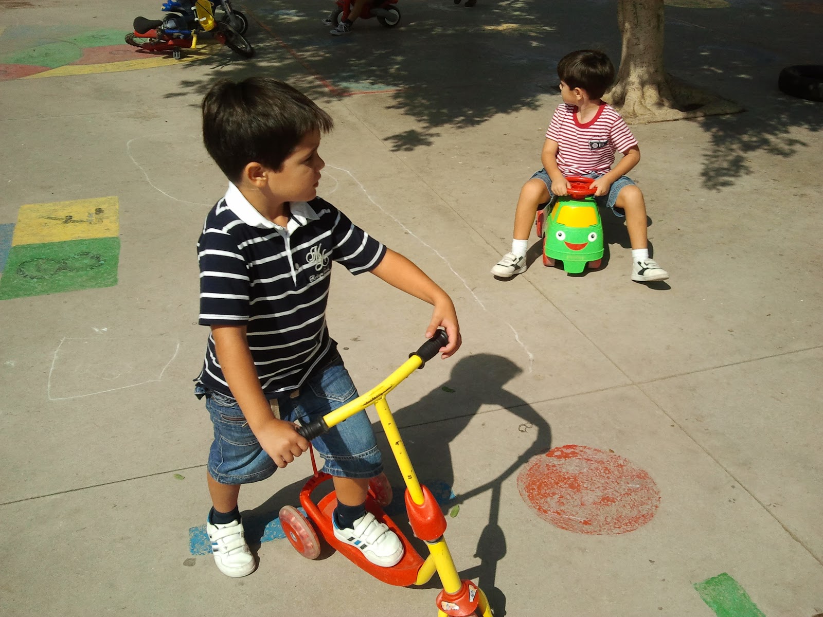 El viernes es el día que hemos elegido para dar un paseo por el patio tras el recreo con las motos y los triciclos. La verdad que aunque ya son mayores, aún les encantan coger las motos.